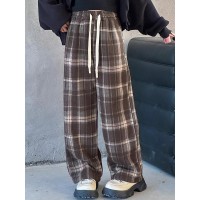 女童加绒裤子冬季新款女大童格子裤百搭毛呢休闲裤儿童阔腿裤