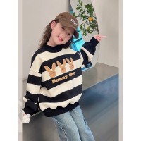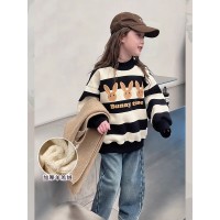 加绒加厚大童装条纹高领卫衣女童中长款洋气上衣儿童冬装新款