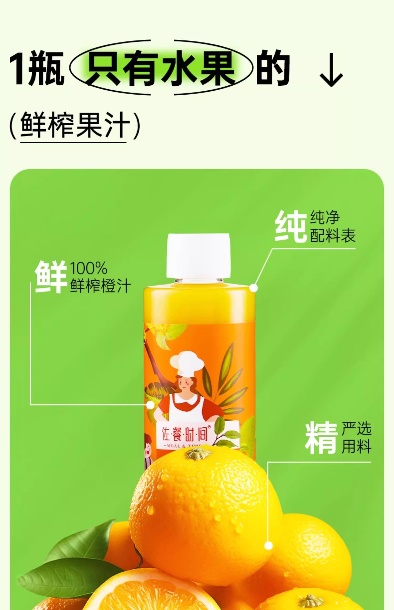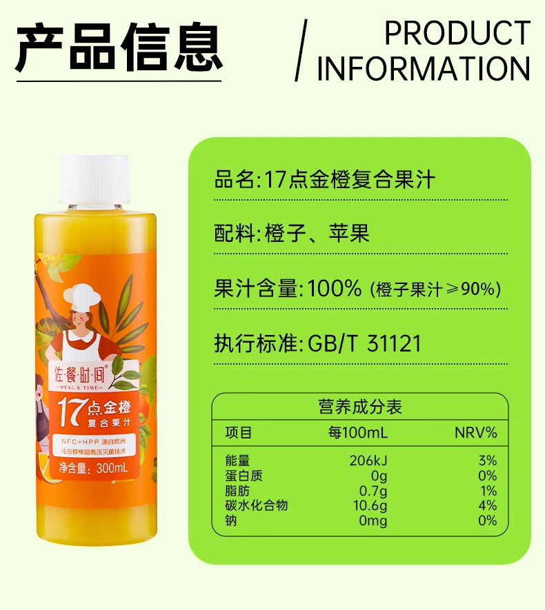 佐餐时间金橙汁NFC+HPP百分百纯果汁冷压榨冷藏饮料300ml*6瓶
