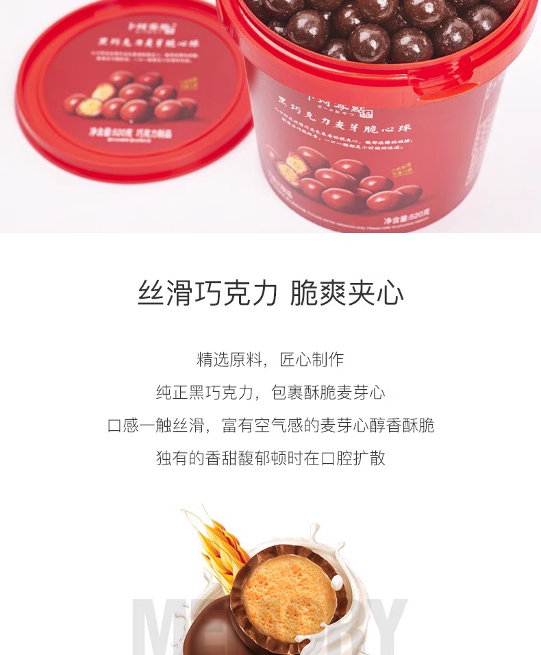 卜珂零点麦丽素桶装520g 怀旧黑巧克力夹心麦芽脆心球过年零食年货糖果
