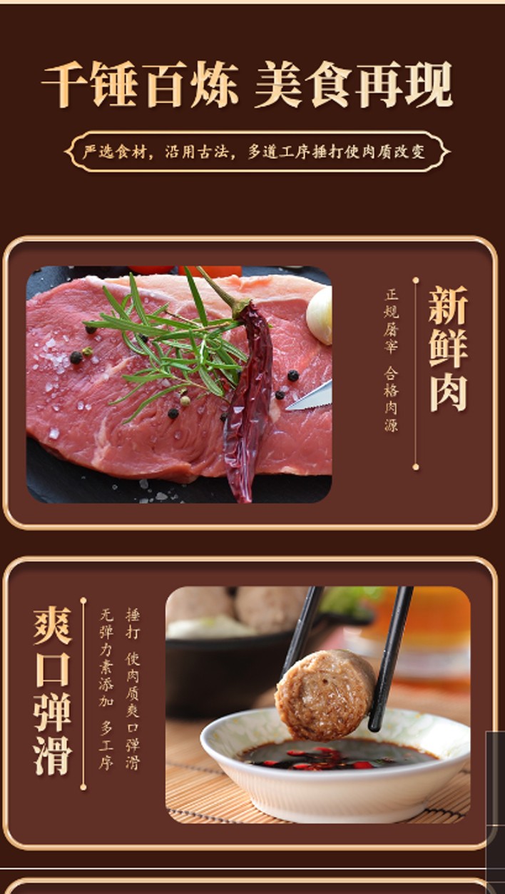 卖点:精选黄牛的后融肉制作而成,口感爽弹,美味无比