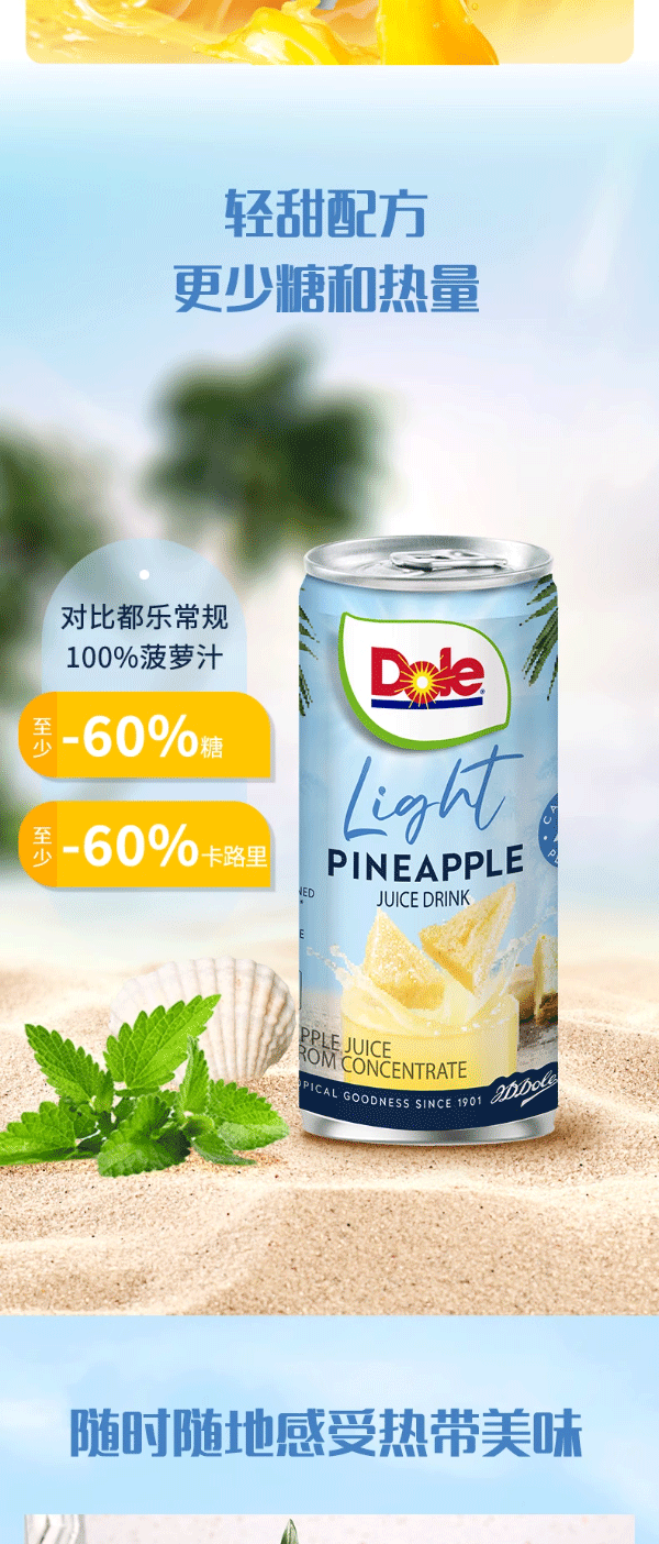 都乐(DOLE)轻甜菠萝汁果汁饮料177ml*6罐1件装菲律宾进口饭搭子饮品