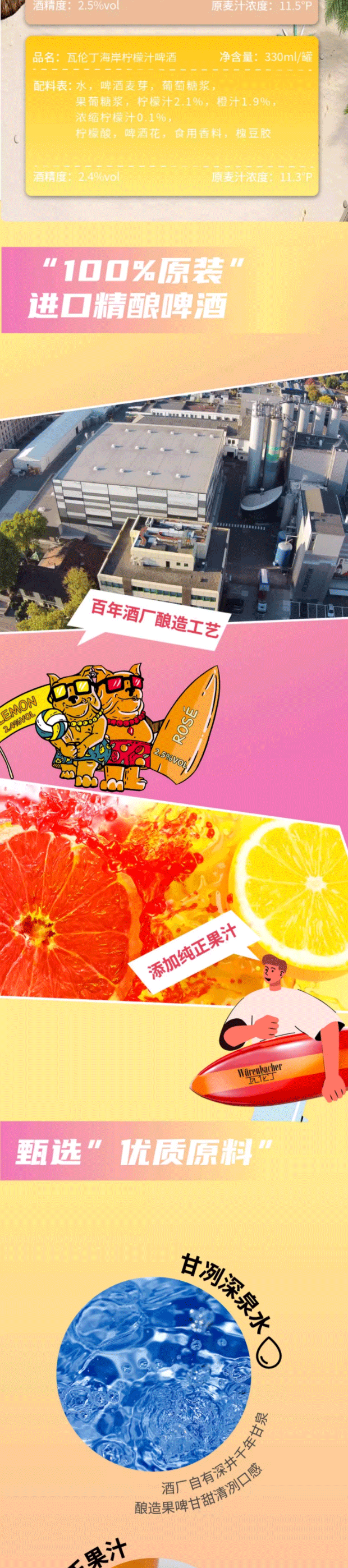 原料/辅料:水,小麦麦芽,啤酒麦芽,西柚汁5.5%,葡萄糖浆,果葡糖浆,柠檬汁1%6,