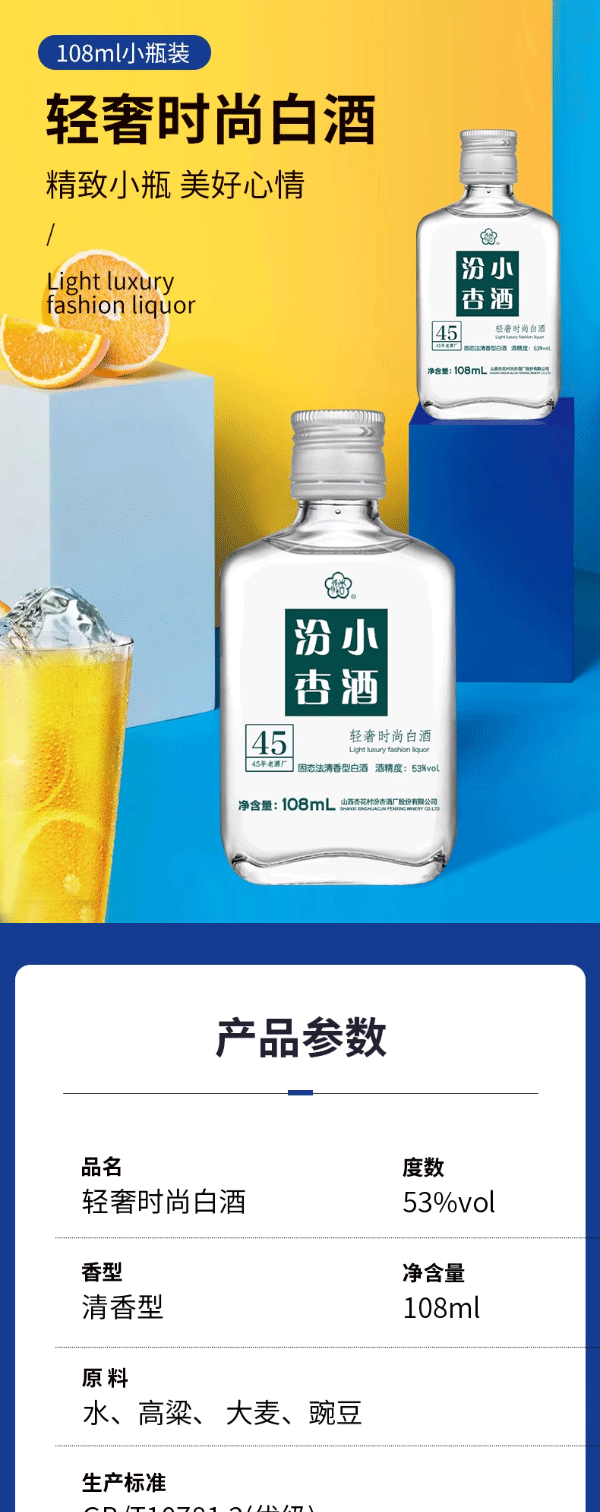 53度汾杏小酒108ml*1瓶酒厂纪念酒礼盒装清香型白酒杏花村产地