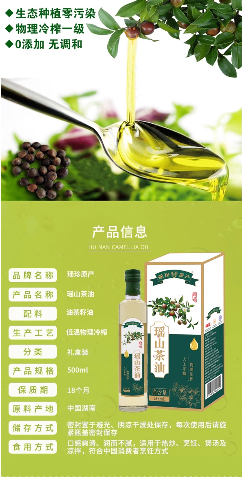 瑶珍瑶山茶油双瓶礼盒采用优质非转基因莱籽油物理压榨而成500ml*2