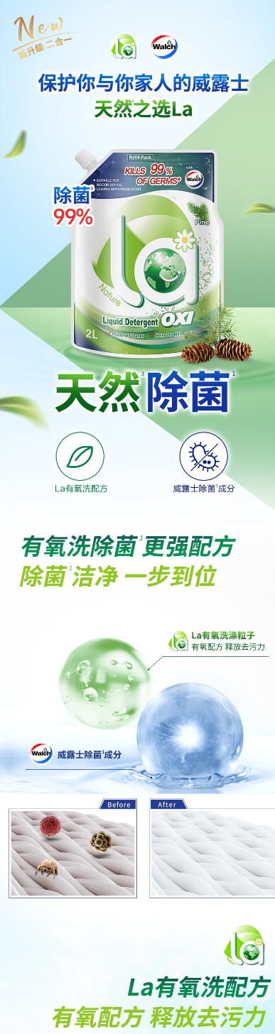 威露士La有氧袋装抑菌除螨松木清香2L机洗手洗补充装家用(4斤)