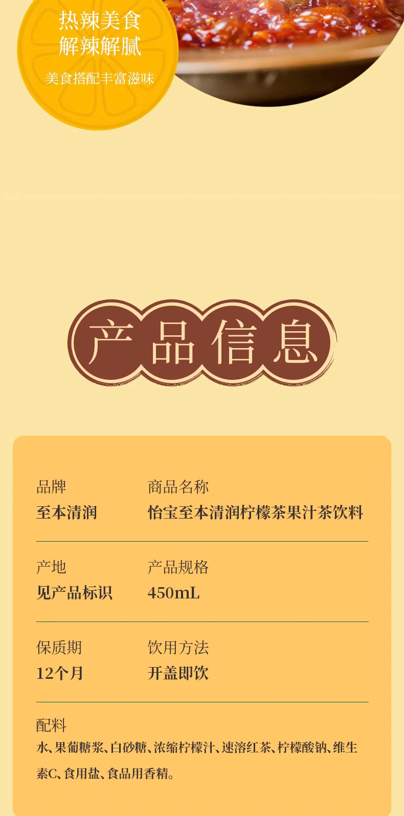 配料/辅料:水、果葡糖浆、白砂糖、浓缩柠檬汁、速溶红茶