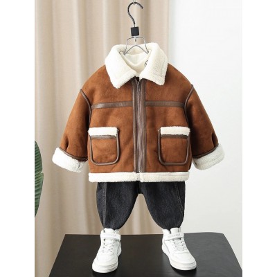 儿童装男童皮毛一体加绒外套秋冬款2023新款加厚男孩宝宝呢子上衣
