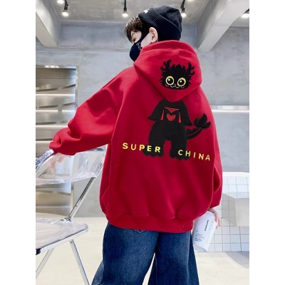 男童红色连帽卫衣加绒加厚冬装新款大儿童冬季一体绒年服上衣