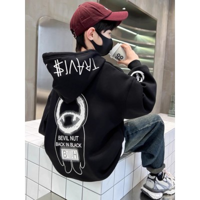 欧哥时尚黑色加绒男童冬装连帽卫衣加绒加厚新款儿童一体绒韩版上衣冬季保暖潮
