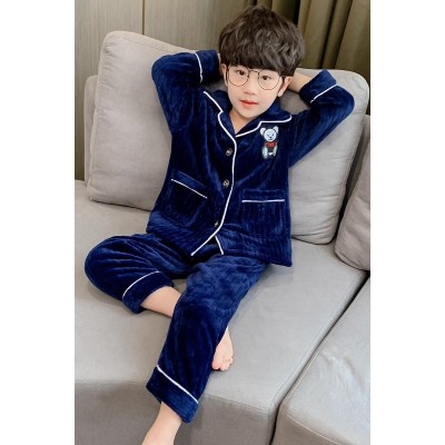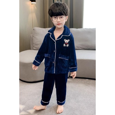 酷尔迪尼藏青色男童睡衣秋冬款新款家居服加绒珊瑚绒男孩中大儿童装冬季加厚