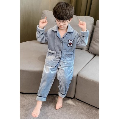 酷尔迪尼浅蓝色升级加厚男童睡衣秋冬款新款家居服加绒珊瑚绒男孩中大儿童装冬季加厚