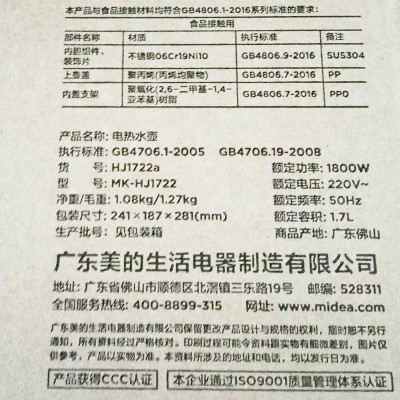 美的(Midea)电热水壶1.7L无缝内胆双层防烫进口控温自动断电