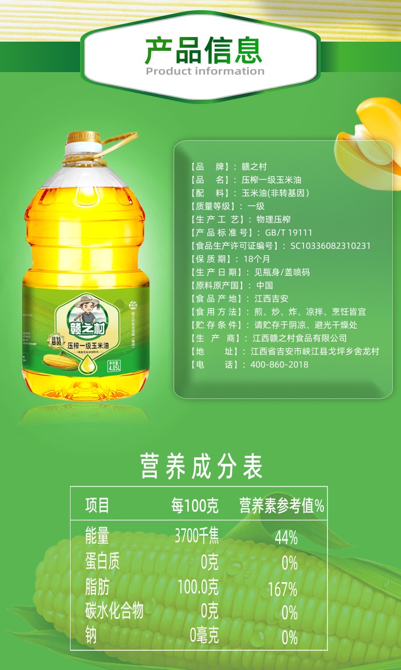 赣之村压榨一级玉米油5L 食用油非转基因桶装