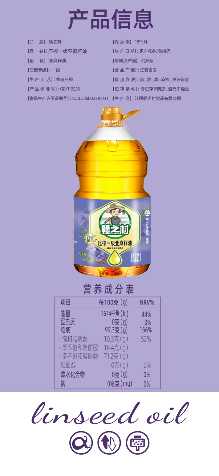 赣之村纯亚麻籽油冷榨一级 5L/桶