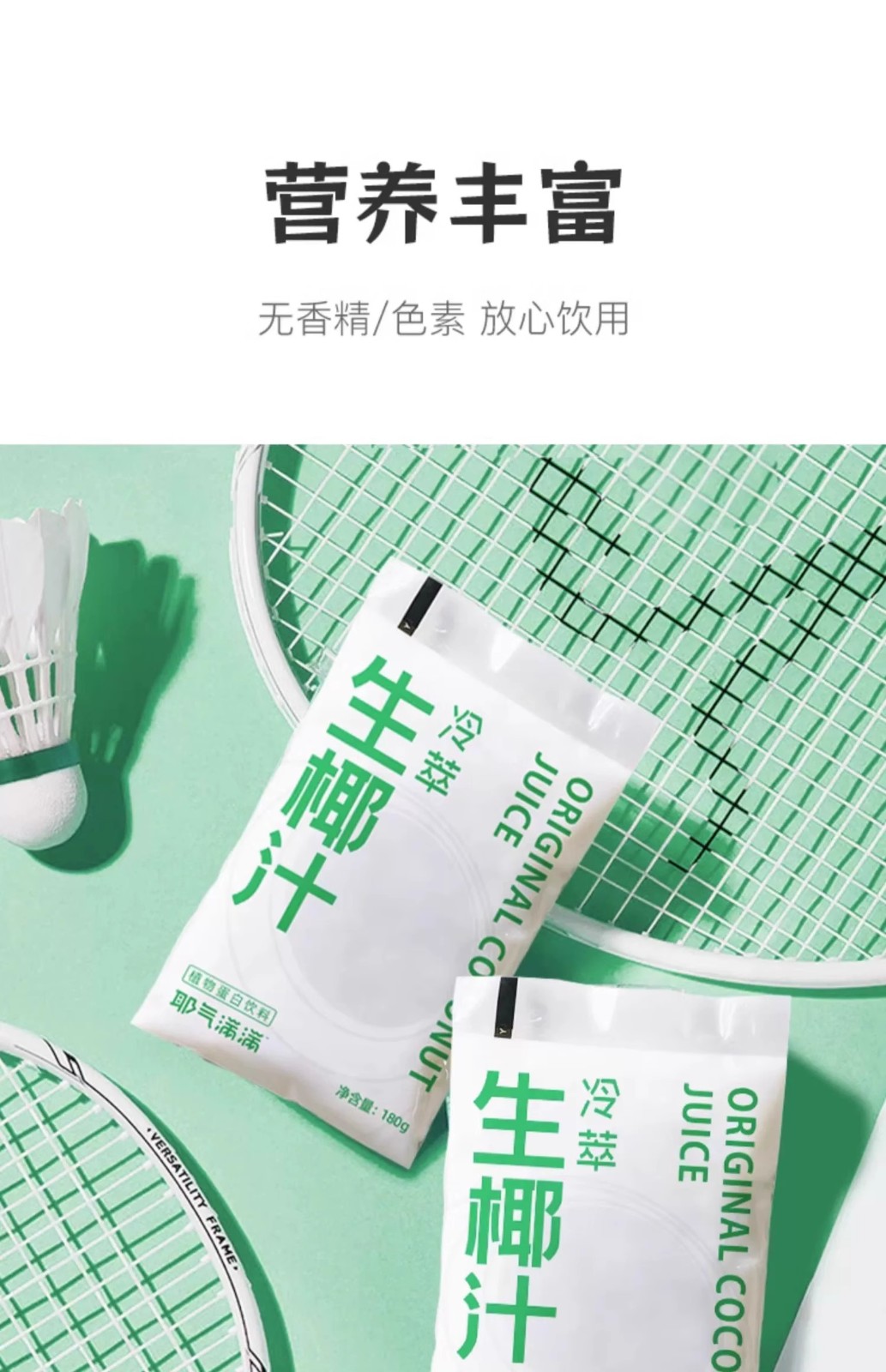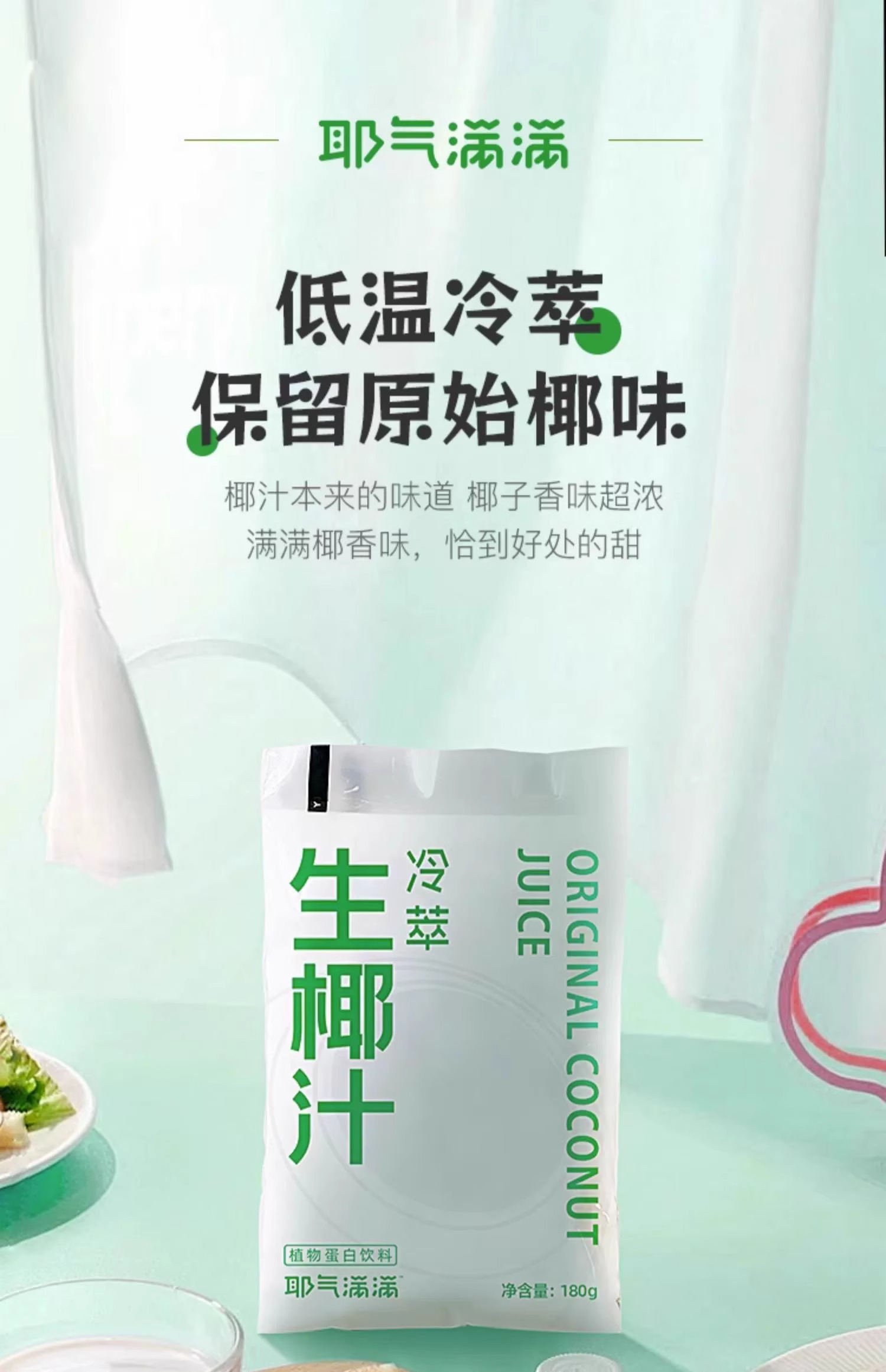 卖点:新鲜椰子肉榨汁,浓郁椰香开袋就能闻到✅ 入口清甜丝滑!浓浓的椰奶香!清爽不腻人! 常温保存方便携带,一次一包✅