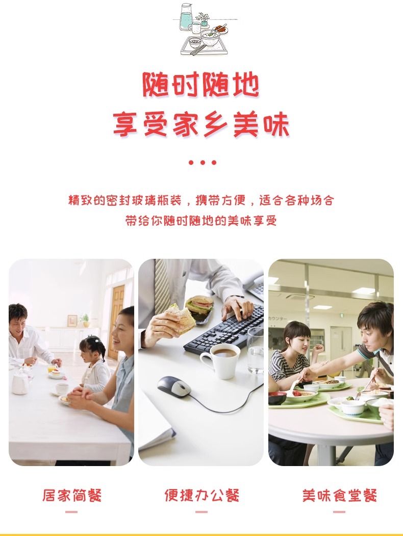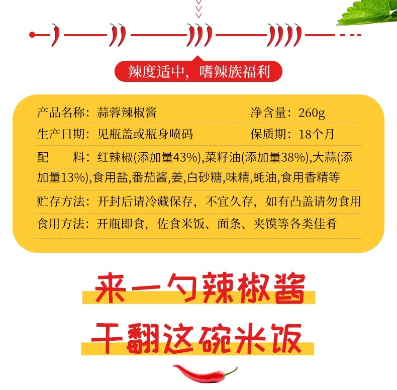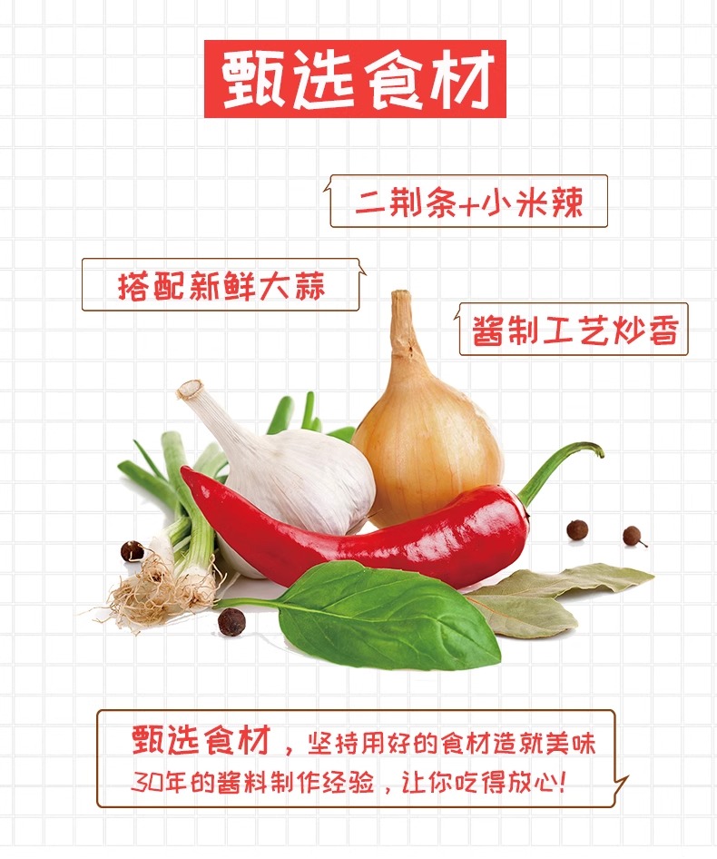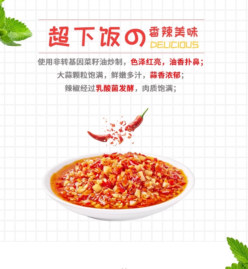 卖点:使用非转基因菜籽油炒制,色泽红亮,油香扑鼻