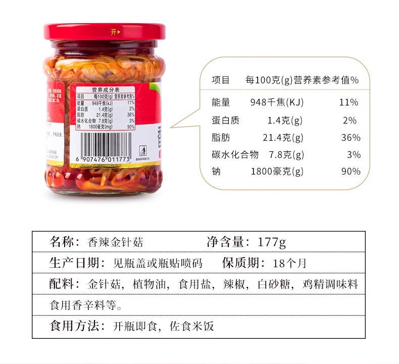 广乐香辣金针菇下饭菜177g*12瓶小零食麻辣开味菜早餐红油咸菜即食