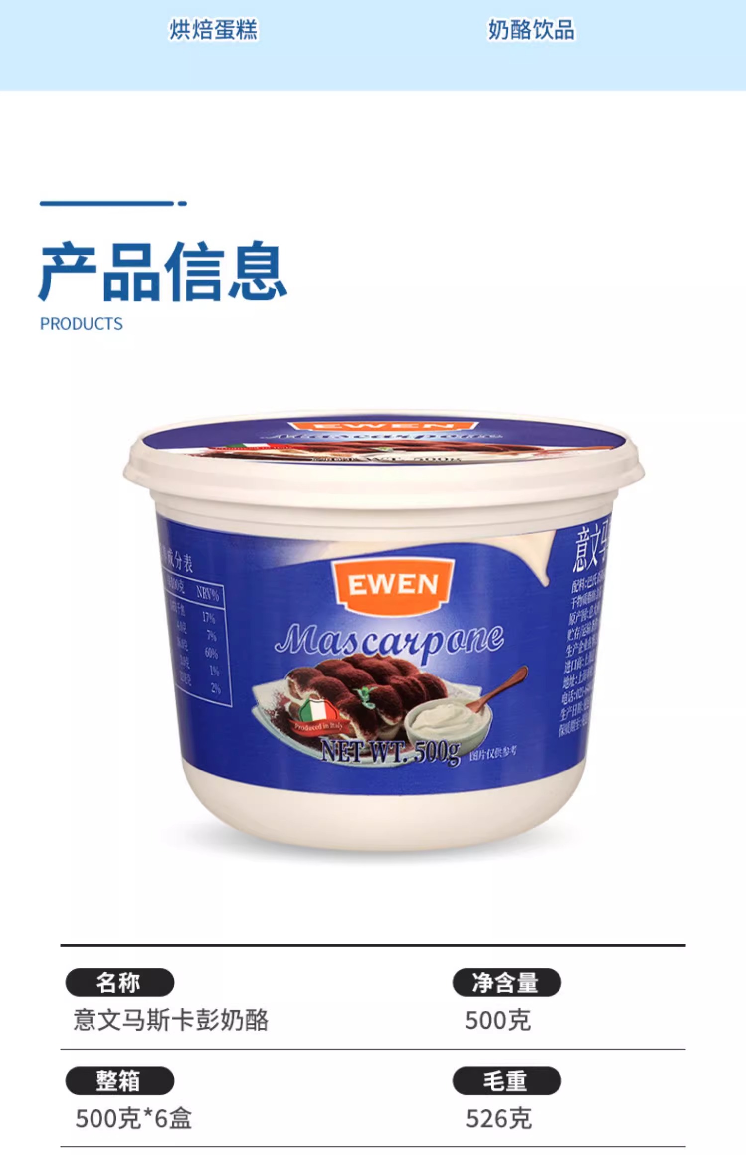 进口意文马斯卡彭奶酪500g 马斯卡布尼奶油芝士蛋糕提拉米苏烘焙
