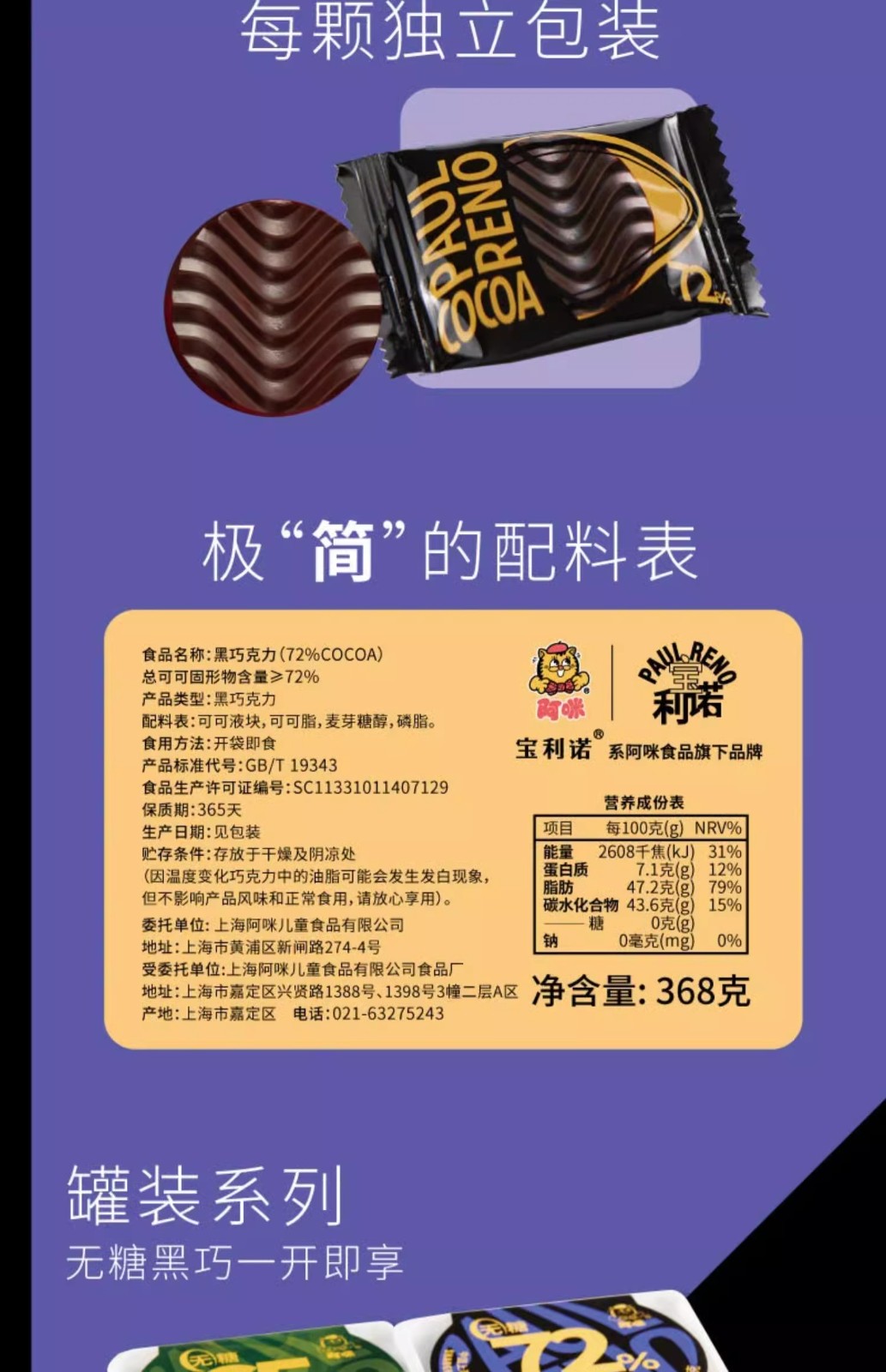 阿咪宝利诺72%纯可可脂无糖黑巧克力健康零食伴手礼368克经典配比