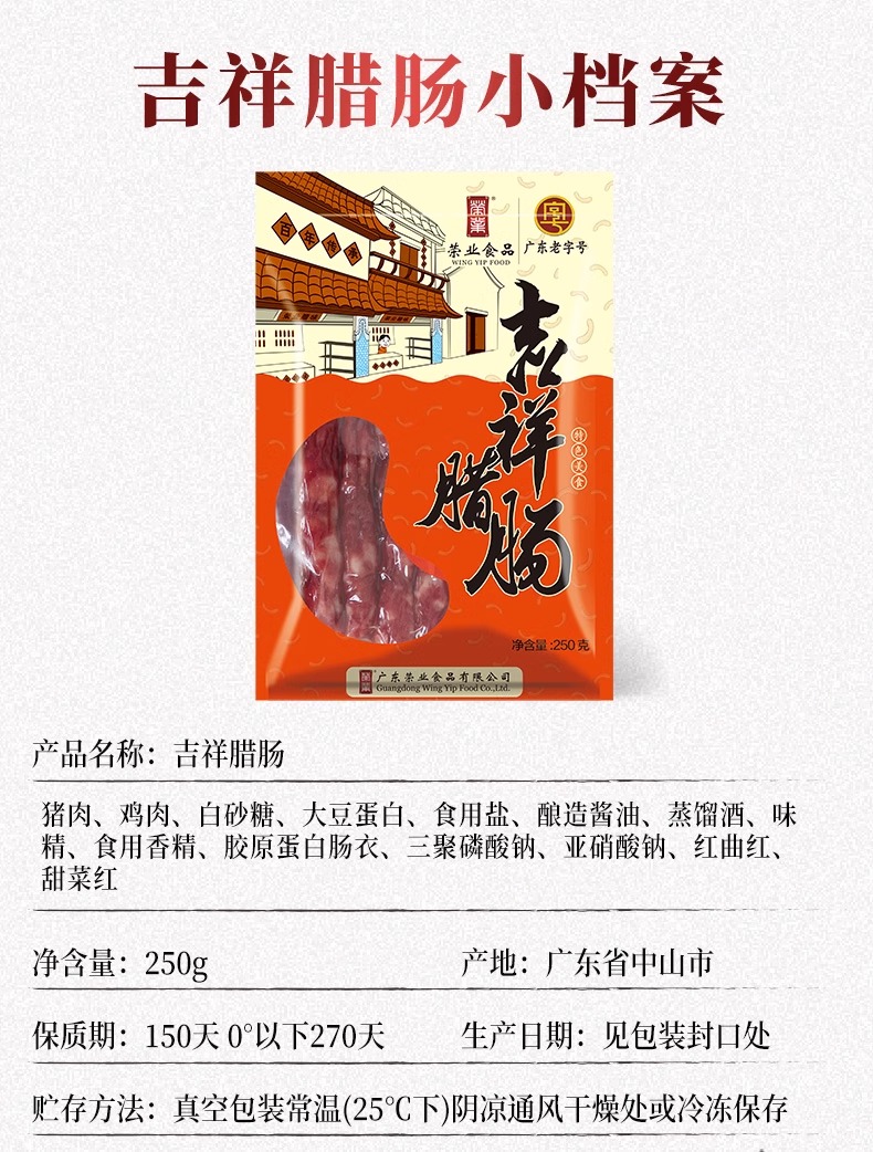 【活动】荣业广式腊肠250g正宗广味香肠甜肠腊味吉祥腊肠广东特产