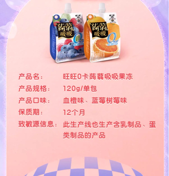 旺旺0卡蒟蒻吸吸果冻120g*6血橙味蓝莓树莓味0糖0脂肪