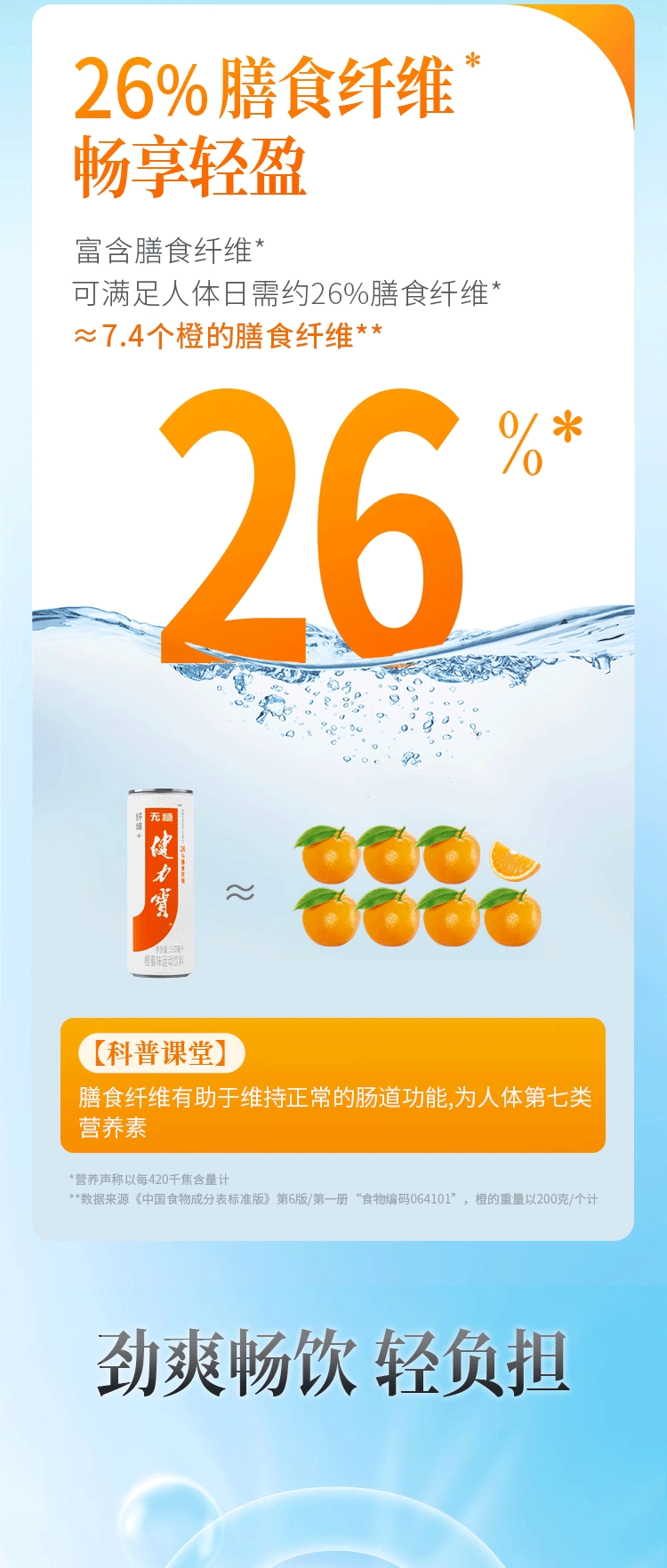 健力宝纤维+橙蜜味无糖0糖0脂330ml*24罐运动碳酸饮料