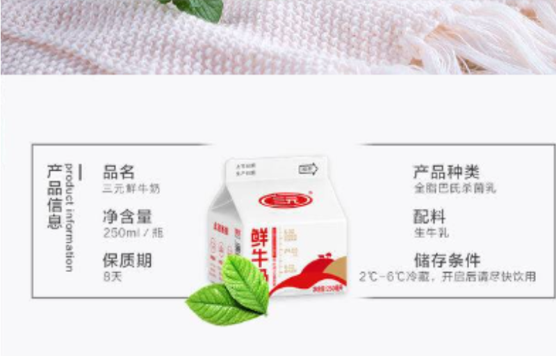 三元纯鲜牛奶 250ml*12盒 整箱装