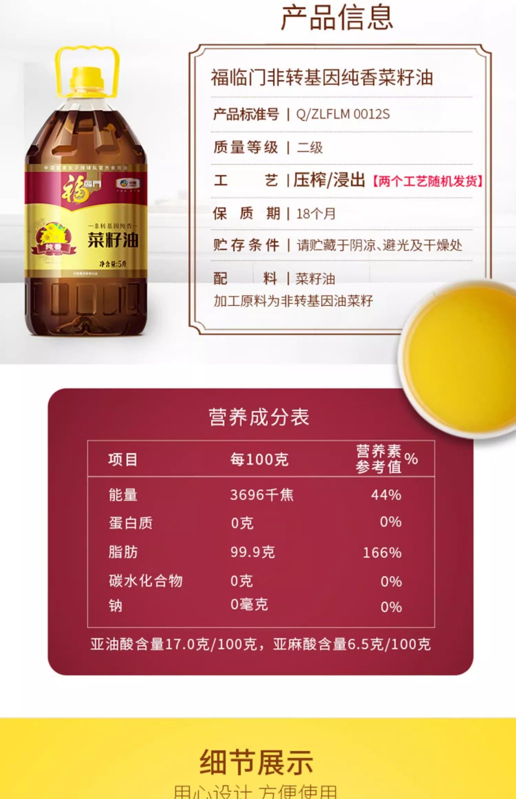 福临门 非转基因纯香菜籽油5L/桶 味道醇香 食用油 中粮出品