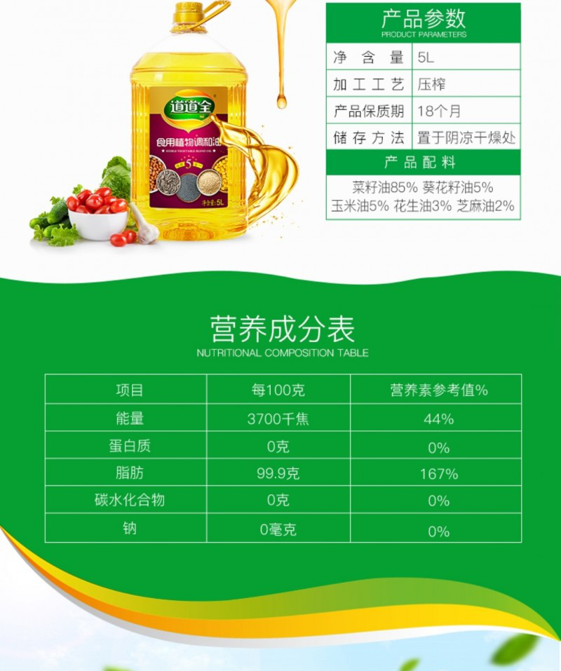 道道全食用植物调和油物理压榨,滴滴健康5L