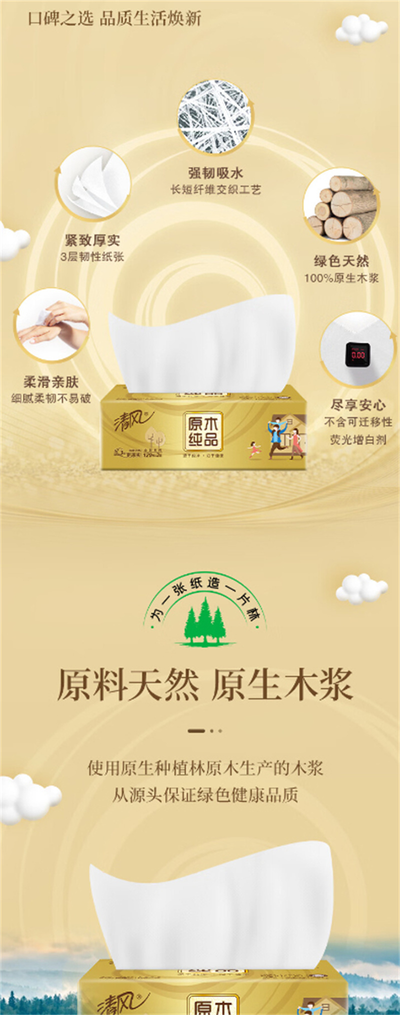清风抽纸纸巾金装原木3层130抽整箱24包