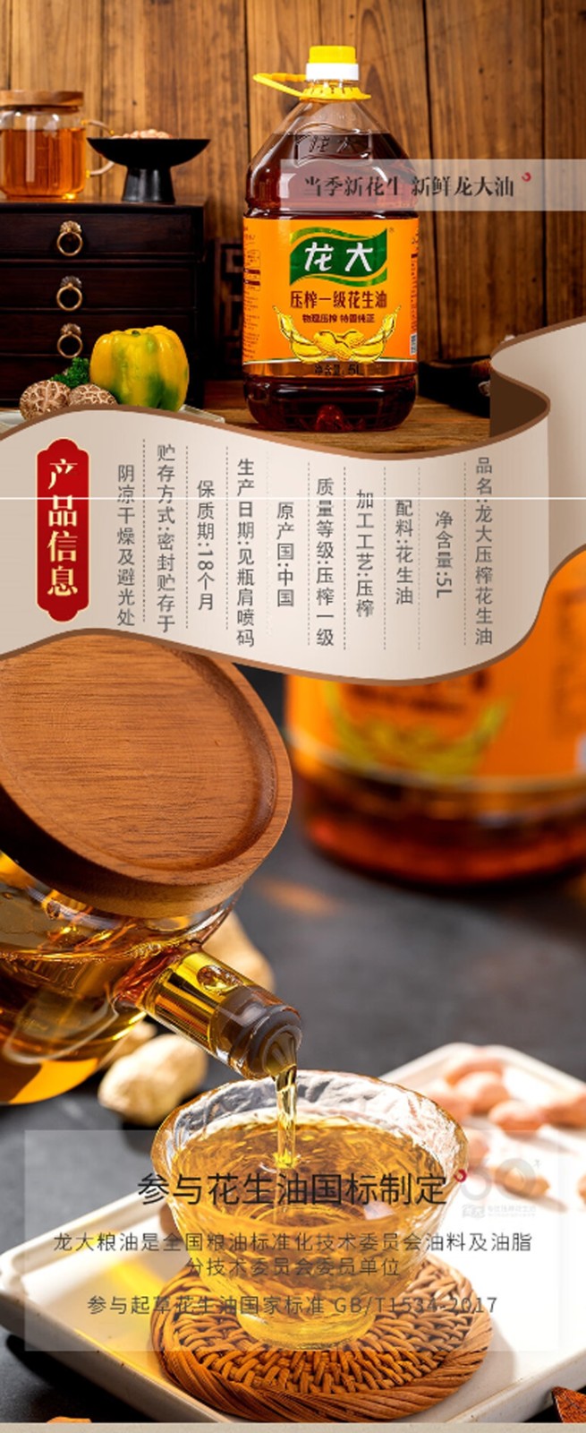 龙大压榨一级花生油独具匠心,滴滴美味,保留传统经典莱油风味5L*1桶