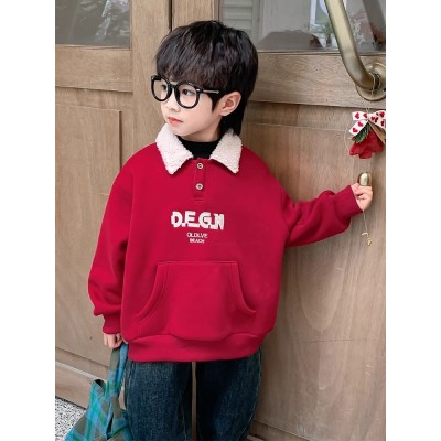 男童加绒卫衣冬装新款儿童装秋冬季红色加厚翻领上衣男孩喜庆